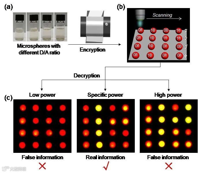 有机微纳激光在光控制下可以输出不同的激光信号,对不同属性的激光信号进行解析以及光子学编码,从而可以构建多个编码态,为信息容量及信息安全强度的提高提供了非常优异的体系。研究人员采用自上而下的精密微加工技术,将含有不同信息单元的微纳激光器进行阵列化。构筑的智能响应的微纳激光阵列只有在特定功率激发光下才可以获取真实有效信息,从而实现激光信号的数字化读取与加解密功能应用,为后续有机纳米光子学的研究与器件设计提供思路及理论依据。