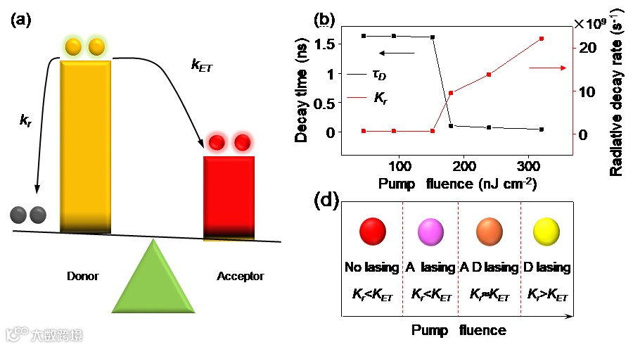 进一步,研究人员通过时间分辨瞬态荧光光谱、高性能条纹相机系统等技术,探究了微纳谐振腔体系中给体分子辐射速率(Kr)与能量转移速率(KET)之间的竞争机制。研究表明,随着激发功率的增加,谐振腔可发射不同的光信号:
