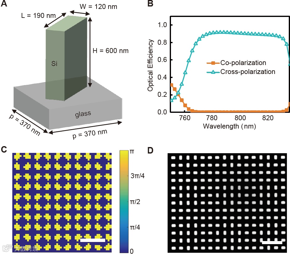 图2:超构表面光学芯片的设计与制备。(A) 超构单元的几何结构:周期370 nm,硅纳米柱长190 nm,宽120 nm,高600 nm。(B) 不同激光入射波长下,两种圆偏振状态的转换效率。(C) 计算所得的超构表面光学芯片的相位分布。比例尺:5 μm。(D) 使用电子束光刻技术制备的超构表面光学芯片的扫描电子显微镜图像(局部视图),比例尺:1 μm。