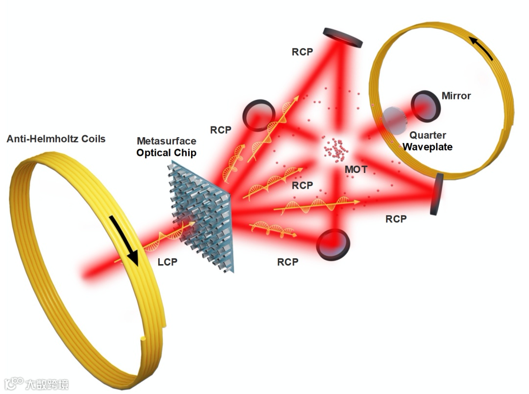 图1:基于介质超构表面光学芯片的单束激光冷原子产生装置。基于硅的介质超构表面将单束入射圆偏振激光分为五束。经过反射后,所有光束在四极磁场的中心相交,其中激光束的动量总和为零,从而满足三维原子冷却和俘获条件。