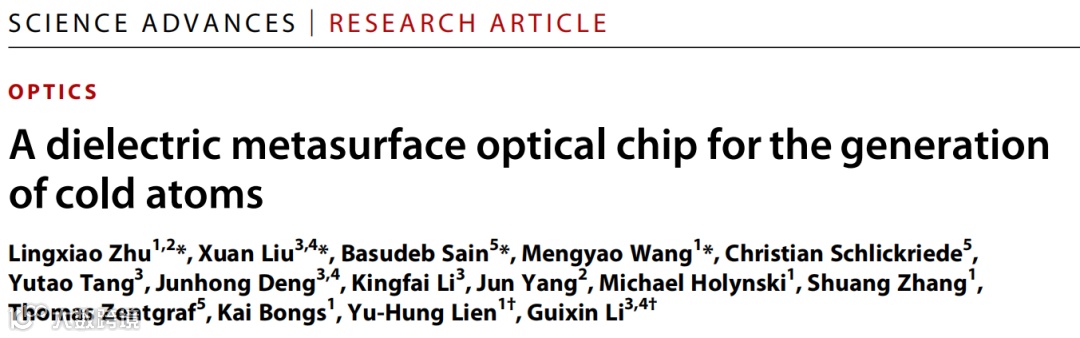 L. Zhu, X. Liu, B. Sain, M. Wang, C. Schlickriede, Y. Tang, J. Deng, K. Li, J. Yang, M. Holynski, S. Zhang, T. Zentgraf, K. Bongs, Y.-H. Lien, G. Li, A dielectric metasurface optical chip for the generation of cold atoms. Sci. Adv. 6, eabb6667 (2020).
