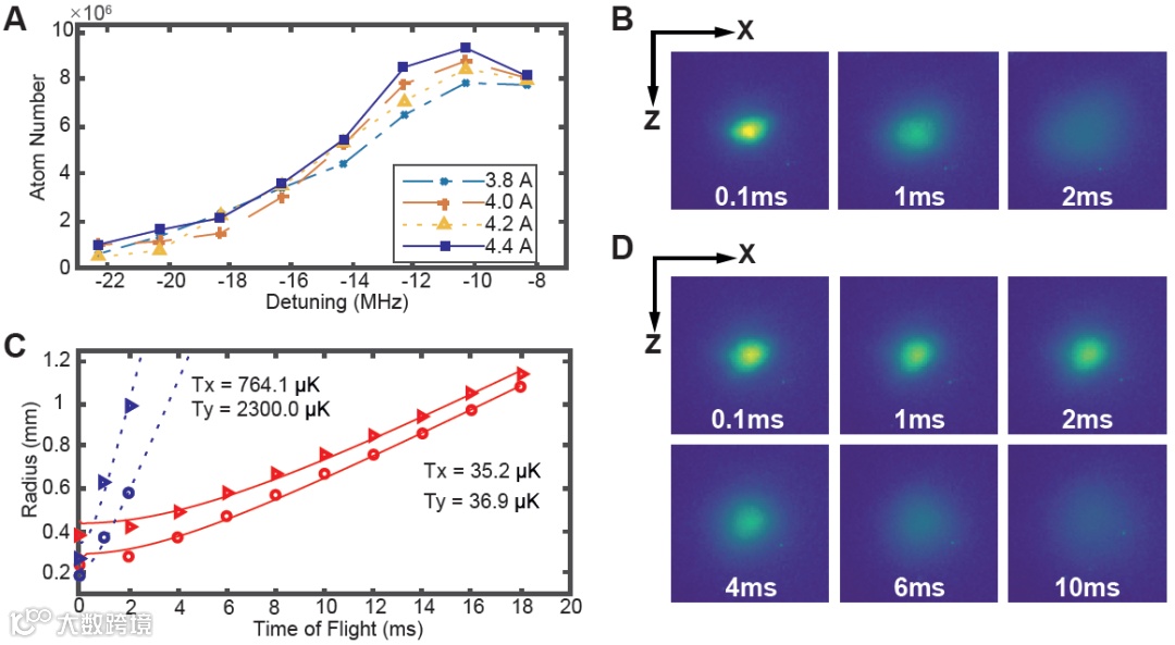 图3:基于介质超构表面芯片的磁光阱性能。(A) 在不同磁场线圈电流下,捕获的原子数随激光失谐的变化关系。测量时固定激光强度,每个数据点为五个实验结果的平均值。在共振以下约10MHz的失谐处捕获的原子数达到峰值,当线圈电流为4.4A时,捕获的原子数约107。(B) 从磁光阱中释放的87Rb原子团在不同时长的自由膨胀后的吸收图像,原子团膨胀的速度反应了原子团温度。(C) 采用飞行时间法测量原子团温度。拟合 87Rb原子团半径的1 /