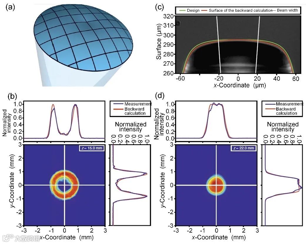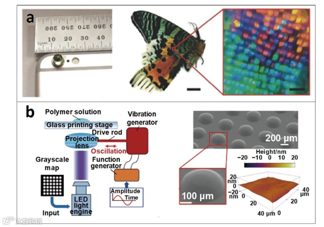 在光学器件打印方面,采用面投影立体光刻灰度曝光与表面浸润相结合的方法,实现光学镜头的3D打印(图5a),以及振动辅助与灰度曝光相结合的方法,实现表面纳米级光滑度的微透镜阵列3D打印(图5b)。