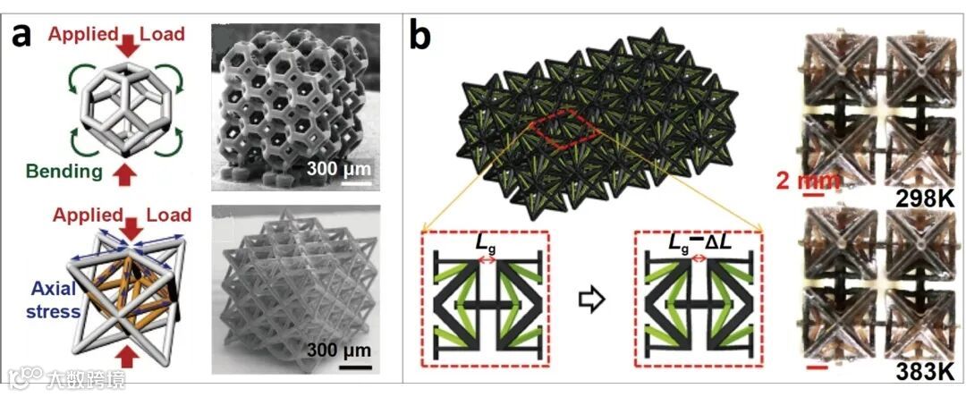 在实现力学超材料方面,通过投影微立体光刻3D打印技术一次成型以拉压变形占主导的八隅体桁架结构超轻-超硬力学超材料(图4a),通过多材料投影微立体光刻3D打印技术一次成型由两种不同刚度和热膨胀系数材料构成的负热膨胀系数超材料(图4b)。
