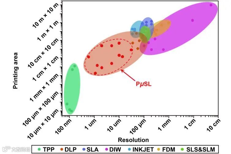 增材制造,又称3D打印,是一种以数字模型文件为基础,将部件离散成二维图形或者路径,通过逐层叠加的方式构造三维物体的快速成型技术。对比于传统制造方法,3D打印因具有制造高精度复杂三维结构、节省材料、方便快捷等优点,已被应用到航空航天、生物医疗、电子、汽车等国民经济领域。自被发明以来,3D打印发展出了各种不同的技术,包括熔融沉积成型(FDM)、墨水直写(DIW)、喷墨(Inkjet)、立体光刻(SLA)、选区激光烧结/熔融(SLS/SLM)、双光子(TPP),以及基于数字光处理(DLP)的连续液体界面制造(CLIP)、大面积快速打印(HARP)、投影微立体光刻技术(PμSL)等。对比于其他3D打印技术,投影微立体光刻技术因其可同时实现高分辨率与大幅面3D打印(图1),被应用于前沿领域的复杂三维结构制造,并产生了一系列具有影响力的科研成果。南方科技大学葛锜副教授、湖南大学王兆龙助理教授与麻省理工学院Fang教授团队联合深圳摩方材科技有限公司针对投影微立体光刻3D打印技术在最近所做的相关代表性工作逐一地进行了详细介绍。