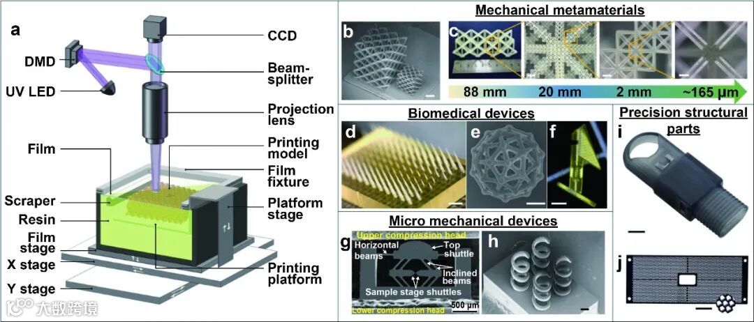 投影微立体光刻是一种通过将构成三维模型的二维离散图案投影到光敏树脂表面,激发局部光固化反应的方式,逐层叠加成型三维结构的3D打印技术。通过对光路系统、光源以及打印工艺的优化,最高打印精度可达到0.6微米。面投影微立体光刻因其能够快速一体化成型高精度、跨尺度、多材料复杂三维结构,在力学超材料、光学器件、4D打印、仿生材料以及生物医药方面应用广泛。深圳摩方科技有限公司将原有投影微立体光刻3D打印技术进行发展与升级(图2a),并成功地将其转化为工业级3D打印装备,实现了稳定的超高精度-大幅面3D打印(精度:2微米,幅面:50毫米×50毫米;精度:10微米精度,幅面:94毫米×52毫米幅面),用于力学超材料、生物医疗器件、微力学器件及精密结构件等工业应用(图2b-j)。
