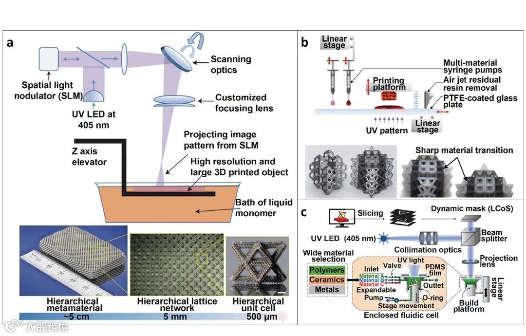 在实现跨尺度、多材料3D打印方面,采用面投影与图形扫描技术相结合的方法实现了跨尺度3D打印(图3a),采用吹气辅助投影微立体光刻法(图3b)与流体控制法(图3c)实现了多材料三维结构的快速打印。