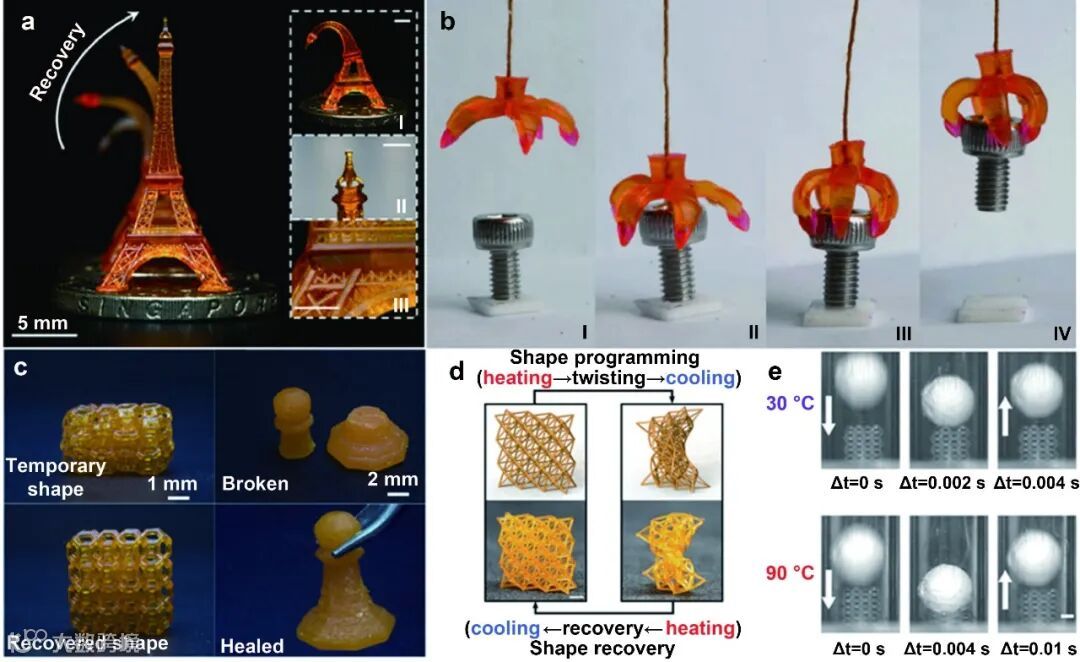 在4D打印方面,通过开发形状记忆光敏树脂,实现了大变形4D打印(图6a)、多材料4D打印(图6b)、自修4D打印(图6c),4D打印超材料结构(图6d)与4D打印吸能结构(图6e)等案例。