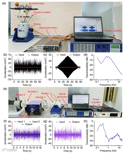 在这篇文章中,研究人员运用机器学习算法,成功实现了超材料的能量循环机制,设计了完美的机械能隔离超材料,并从理论和实验上证实了其卓越的全频带能量屏蔽性能。设计完成的机械超材料由绝对零刚度单元阵列构成,图2所示。当外界对超材料做正功(机械能自能量源流入),机械能完全转化为超材料构件势能;而当外界对超材料做负功,超材料构件势能释放完全返回能量源.在整个能量循环过程中,目标区域完全不受影响。对超材料宏观单元的实验表明,该超材料实现了对确定性振源和随机振源的卓越的隔振效果,低频性能甚至能达到 0.3 Hz (理论上能全频段绝对屏蔽机械能,实验上受加速度传感器限制只能测到 0.3 Hz ) ,图3所示。该超材料的隔振性能优于商用的准零刚度隔振器 MinusK ,隔振性能的直观展示见动图。