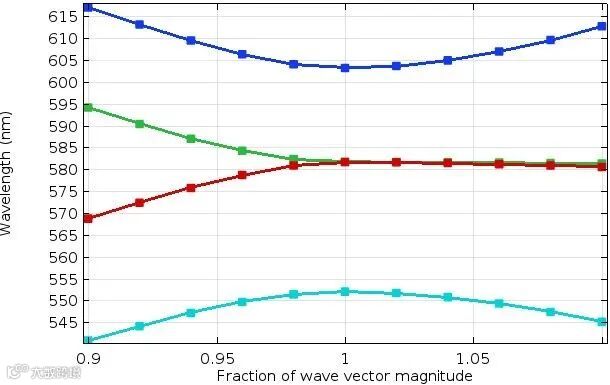 3,根据文章补充材料的信息,该钙钛矿材料的折射率在550nm波长附近具有非常大的色散,所以正确的做法应该是按照COMSOL软件案例库的bandgap photonic crystal那样去考虑色散。但是想要照葫芦画瓢,建一个三维模型,去构建非线性特征值方程并用稳态求解器来求解特征,没有想象的这么简单。我反正试了一下,发现收敛性很差。