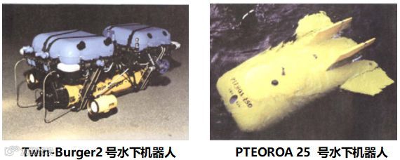日本在上世纪90年代前后,已为发展UUV技术进行了相应的投资,主要的研究领域包括:高性能电池、无污染的推进系统、高效的热机技术、高数据率水声通信技术、低成本的地形匹配和精密导航技术、低噪声和低电磁的传感器技术、涂层隐身技术、控制UUV的人工智能、神经网络和模糊逻辑等技术、高可靠性和低维护技术等。下图分别是东京大学研制的Twin-Burger2号水下机器人和PTEO–ROA 25号水下机器人。
