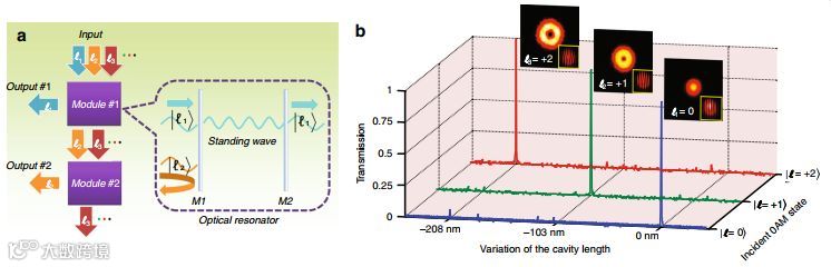 ( a ) 基于级联模块化设计的所需OAM分选系统的概念图。例如,三个不同的OAM状态(l1,l2和l3)进入系统。第一模块输出一个状态(l1),同时拒绝其他状态(l2和l3)并将其重定向到下一个模块,其中状态l2与另一个状态l3分离并退出分类器。每个模块的主要组件是一个调谐到特定入射OAM状态的光腔/谐振器。M1和M2是形成Fabry-Pérot腔的高反射镜。由于共振隧穿,共振OAM状态经历了通过腔的高传输,而非共振状态在腔内经历了破坏性干扰,因此被完全反射。( b ) 根据Fabry-Pérot腔的长度变化,测得的各种OAM状态的透射率。插图显示了参考平面波的透射强度分布和相应的前叉干涉图。