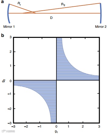 (a)曲率半径在图中标出。(b)阴影区域表示稳定的空腔区域,包围阴影区域的双曲线表示g1g2 = 1。