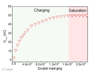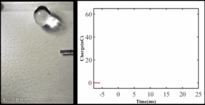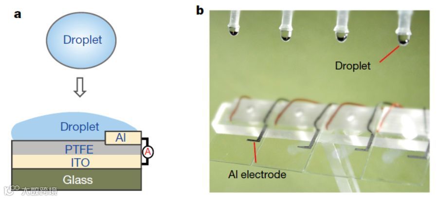 PTFE/ITO和Al电极的作用类似于场效应管中的源极和漏极,用于储存、转移电荷,而动态的水滴则与FET中的栅极门有着异曲同工之妙。栅极作为一个开关,使源极和漏极之间形成通路,表面储存的大量电荷可以藉此得以释放。