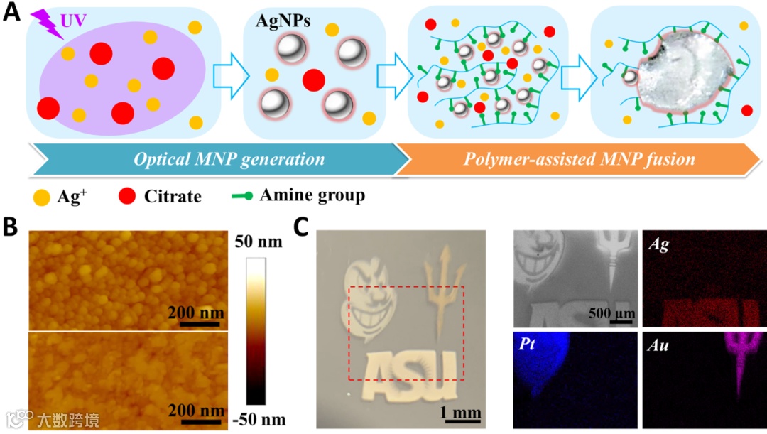 图2. 利用高分子辅助光化学沉积技术打印连续金属材料。(A)反应原理示意图;(B)AFM下观察到的金属纳米颗粒融合过程;(C)多金属打印。
