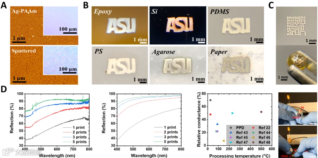 与其他金属加工技术相比,PPD技术具有一些显著优势。首先,反应体系中的高分子可以稳定细小的纳米晶粒,使金属的生长过程更接近原子堆积,从而有效提高产物的致密度与平滑度。例如,可以用PPD制备6 nm左右的金属薄膜并仍然保持很好的平滑度。而用蒸镀的方法制备的类似薄膜则具有很强的颗粒感(图3A)。其次,PPD的温和液相反应条件具有广泛的基底适应性,体系中的高分子对大多材料也都具有一定的亲和性,能在多种表面上直接打印金属,甚至包括含水量达99%的水凝胶(图3B)。同时,还可利用PPD一步制备微电极阵列或三维金属结构,应用十分广泛(图3C)。最后,PPD所制备的金属结构具有与理论计算相当的反光性与导电性,远远超过其他金属打印方法所得到的产物。这使其在光学、电学器件领域具有广阔的应用前景,如可利用PPD在弹性基底表面打印金属制备柔性电极等(图3D)。