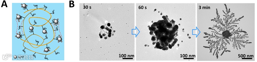 图1. 高分子控制下的金属生长。(A)原理示意图;(B)TEM下的金属生长实例。
