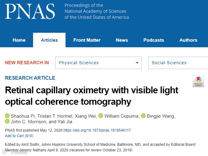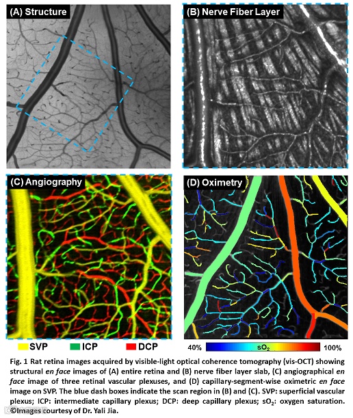 视网膜局部代谢异常是造成很多眼科疾病的元凶。对其准确测量有望解开很多眼科疾病的谜团,为诊断和治疗提供新的依据。 美国Oregon Health and Science University (OHSU) Prof. Yali Jia课题组研发了可见光OCT视网膜毛细血管血氧仪用于大鼠毛细血管血氧饱和度测量,该技术有望在人体对视网膜局部氧代谢速率进行无创测量。2020年5月12日,美国国家科学院院刊(PNAS)杂志在线发表了该项研究成果,题为“Retinal Capillary Oximetry with Visible Light Optical Coherence Tomography”。