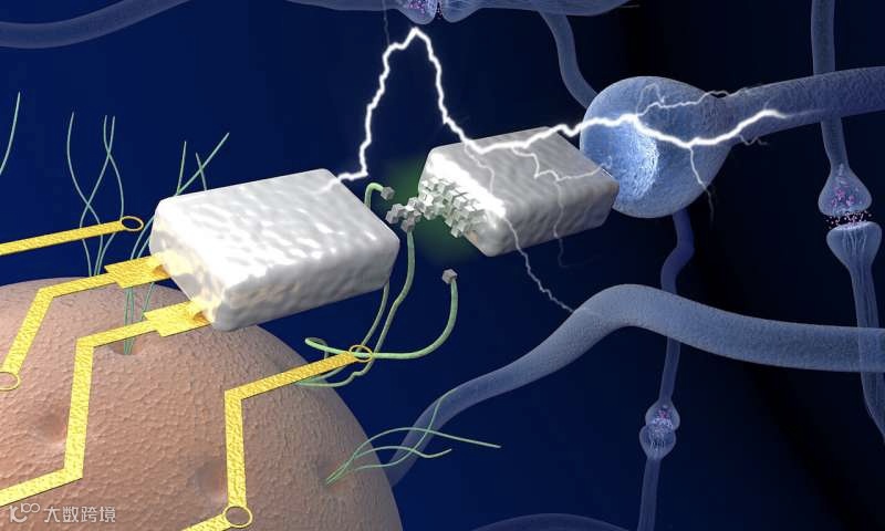 从微生物地杆菌中提取的蛋白质纳米线(绿色),促进了记忆电阻器装置(银色)在生物电压下工作,模拟了大脑中的神经元组件(蓝色连接)