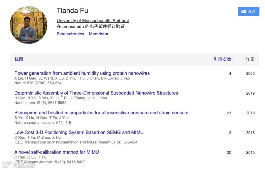 根据Google学术,他的研究方向是生物电子以及忆阻器。算上本次发布的论文,共计发表论文6篇,其中2020年有2篇发布在Nature上,一篇发布在Nature communications。