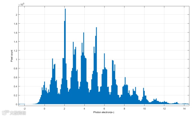 为了直观验证这一点,我们通过蒙特卡洛模拟,还原了“平均每像素3个光电子”场景下,不同读出噪声对像素输出的影响:当读出噪声降至0.3e⁻以下时,光电子的信号峰清晰可辨,能精准计数;而噪声稍高,信号峰就会被“淹没”。从下图中可以看出读出噪声对实现光子数解析的重要性。