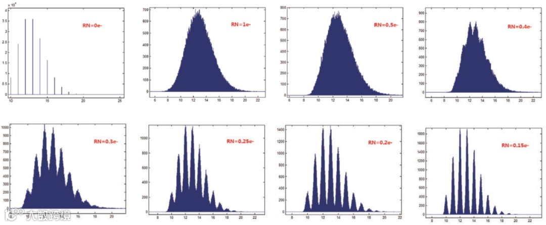 以上为蒙特卡洛模拟不同读出噪声下像素输出分布图