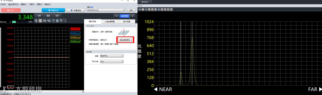 (2)点击【测量对象波峰】——选择【第1个峰值-第2个峰值】,通过第1个波峰为透明物体的上表面,第2个波峰为透明物体的底面,从而相减就被测透明物体的厚度值。