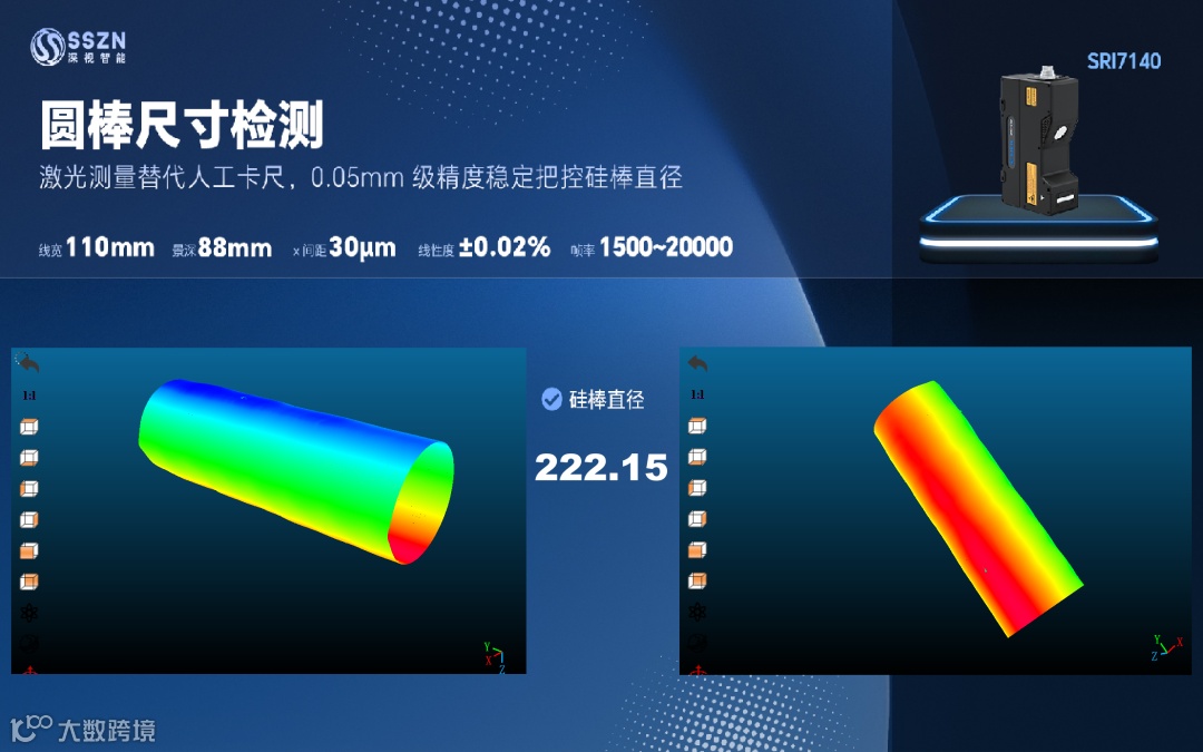 深视智能三维激光轮廓测量仪SRI7140具备70-110mm可调扫描宽度,适配不同规格的硅棒线性度高达±0.02%F.S.确保测量结果稳定可靠;配合1500-20000kHz的扫描速度在高速运行中仍保持优异表现,项目综合精度可达0.05mm