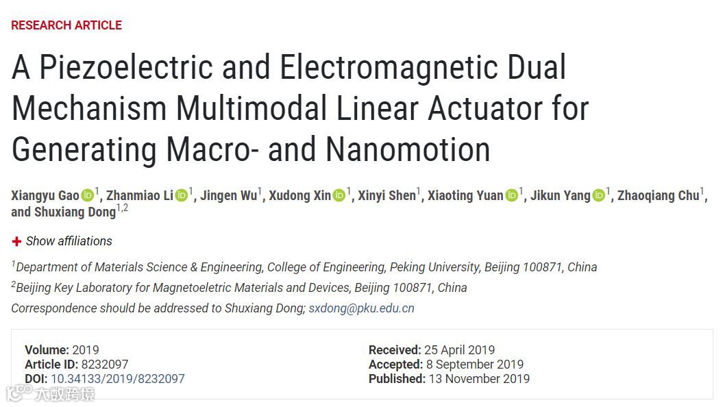 近日,《Science》合作期刊《Research》在线发表了北京大学工学院董蜀湘课题组在压电-电磁双机理直线纳米驱动领域研究的最新进展,文章题目为“A Piezoelectric and Electromagnetic Dual Mechanism Multimodal Linear Actuator for Generating Macro- and Nanomotion”。课题组成员高翔宇博士(北京大学工学院2019届博士毕业生,现为西安交通大学讲师)是该成果的第一作者,董蜀湘教授是论文通讯作者。研究获得了国家自然科学基金委(51772005,51132001)、航天十二院(北京航天芯智汇物联科技有限公司)和磁电功能材料与器件北京市重点实验室的资助。