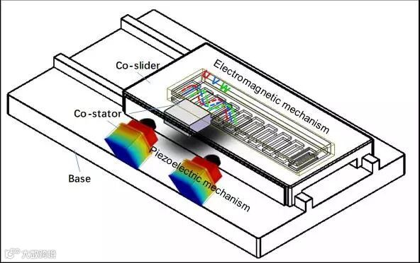 为了解决这一难题,北京大学工学院董蜀湘课题组提出压电-电磁双机理解决方案,并发明了双机理多模态纳米直线运动电机(Dual Mechanism Multimodal Linear Actuator,简称DMMLA),其结构和驱动机理见图1。