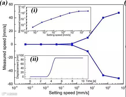 该发明通过共动子与共定子的设计把电磁和压电双机理结合在一起,再利用电磁机理产生宏观快速运动、压电步进机理产生微观低速运动、压电伺服实现纳观运动定位的三种运动模态,实现宏-微-纳全尺度运动精密定位。这种全新的双机理运动系统设计思路,可望有效克服传统各种单一机理马达或电机存在的问题,特别是在解决快速运动、不受局域限制的纳米定位精度的矛盾方面,具有独特优势,目前已申报中国发明专利。样机实测结果显示在电磁宏观运动时最大运行速度51.2 mm/s,压电步进微观运动时速度在0~135 μm/s,在压电伺服纳观运动时最小位移分辨率可达2 nm(开环控制),测试结果见图2,其中图2(a)为电磁宏观运动,最大运行速度51.2 mm/s;图2(b)为压电步进微观运动;图2(c)为 压电伺服纳观运动,最小位移分辨率2 nm。
