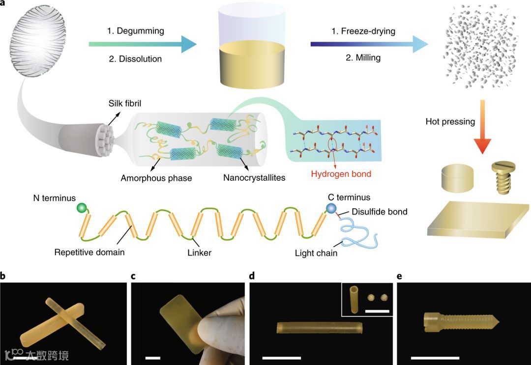 文章报告了一种新的热处理方法,可以将再生的天然蚕丝直接转变为具有力学性能可调的坚固结构材料,同时具有良好的机械加工性,生物相容性和生物降解性。并且这种热处理方法步骤简便、成本较低,蛋白密度较高、功能材料选择性较高。通过较为传统的热加工处理,克服了基于溶液加工的局限性,为丝基材料的制备提供了新思路。