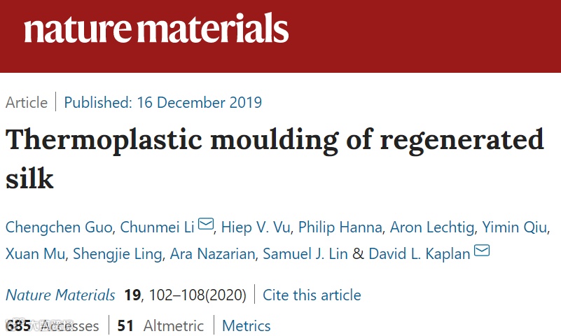 针对这一问题,近日,美国塔夫茨大学的David L. Kaplan、李春梅等在国际著名期刊《Nature Materials》上在线发表了名为“Thermoplastic moulding of regenerated silk”的文章。第一作者为:郭成辰。