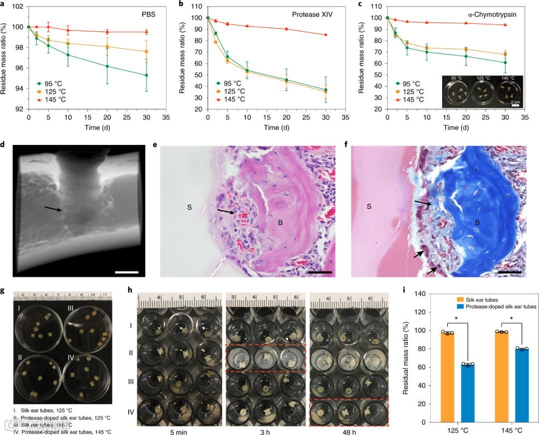 图3.功能性丝基材料的体外降解和体内生物相容性测试
