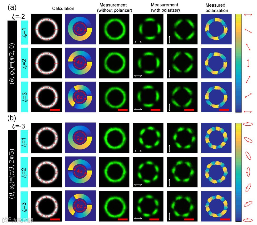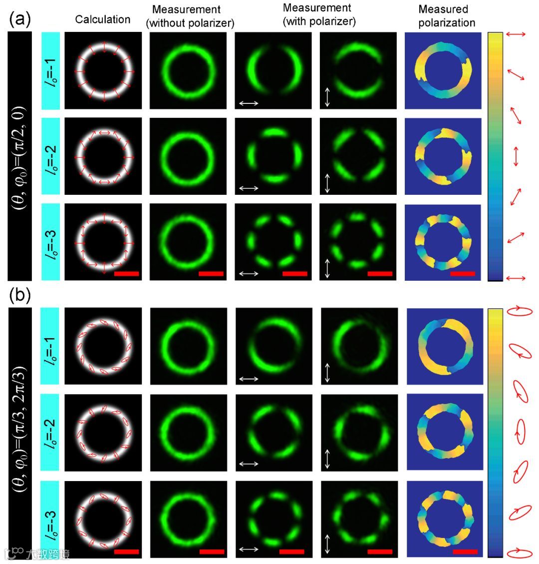 图3.(a)拓扑荷为0,Hybrid-order庞加莱球坐标为(q, j0) =(p/2, 0)的完美矢量涡旋光束产生。该坐标下的偏振态为线偏振态。第一列:计算得到的强度和偏振态分布,红色箭头表示偏振态。第二列:测量得到的强度分布。第三、四列:在x偏振和y偏振选择下的强度分布图。第五列:通过stokes参数测量得到的偏振态分布(b)拓扑荷为0,Hybrid-order庞加莱球坐标为(q, j0) =(p/3, 2p/3)的完美矢量涡旋光束产生。该坐标下的偏振态为椭圆偏振态,各列含义与(a)相同。
