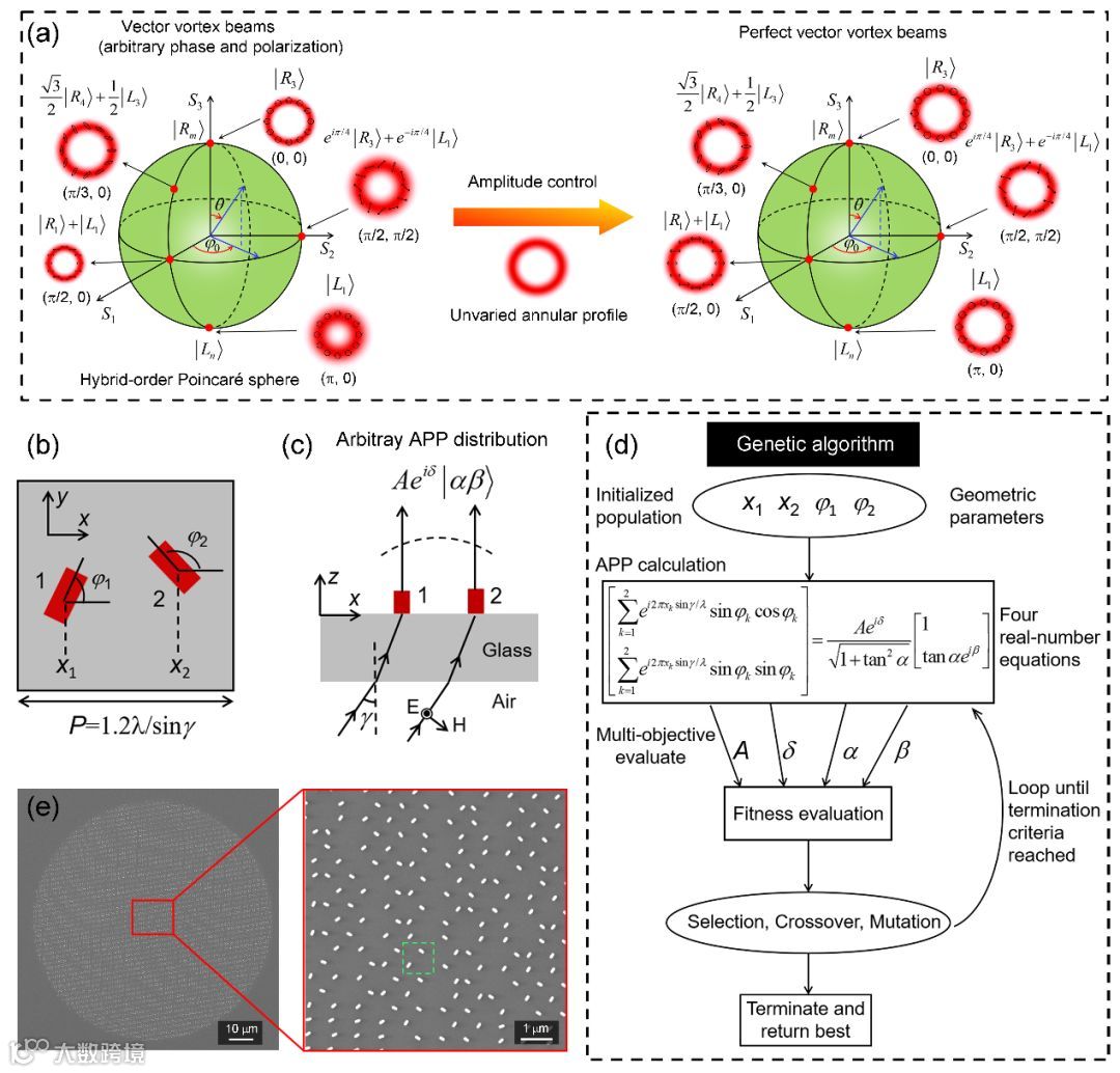 图1.(a)从矢量涡旋光束到完美矢量涡旋光束产生的过程。左侧展示了在hybrid-order庞加莱球上的任意矢量涡旋光束,具有不同的相位和偏振分布,其环行大小尺寸一般随拓扑荷变化而变化。通过加入振幅限制,得到不依赖于拓扑荷变化而变化的完美矢量涡旋光束。(b-c)包含双个单晶硅纳米棒的相干像素示意图。在斜入射下,包含了4个可调几何参数,从而可以实现任意振幅,相位和偏振态的产生。(d)对于任意给定散射态(A, d, a ,b),遗产算法求解几何参数示意图。(e)扫描电镜图和局部放大图。