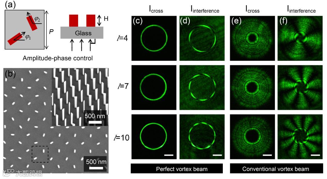 图2.(a)垂直入射下的相干像素示意图,可以实现振幅和相位的独立调控。(b)垂直和斜视角下的扫描电镜图 (c-f)不同拓扑荷下的完美涡旋光束和普通的涡旋光束对比。对于完美矢量涡旋光束,其环行尺寸不随拓扑荷变化而变化,而普通的涡旋光束,其环行尺寸随着拓扑荷增大而增大。
