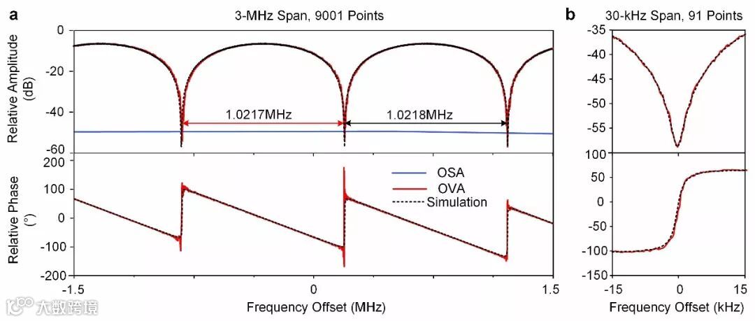 图3:超高分辨率测量结果图。(a)测量带宽为3MHz的幅度与相位响应;(b)测量带宽为30kHz的幅度与相位响应。