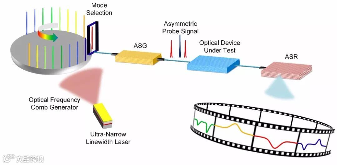 该方法的具体实现方式是:超窄线宽激光器产生的光信号通过光频梳发生器,激发出光频梳信号。模式选择模块按顺序滤出其中一根光梳齿,并生成非对称光双边带探测信号。非对称光双边带探测信号经过待测光器件后,携带上其光谱响应。接收机从非对称光双边带信号中提取光谱响应,从而消除了高阶边带和其他有害成分的影响。通过扫描非对称光双边带探测信号的波长,可获得该光频梳对应的波长通道中的光谱响应。选择其他光梳齿并进行上述操作,可得到光频梳覆盖范围内的光谱响应。在实验中,实现了分辨率为334 Hz、动态范围大于 90 dB、测量范围为1.075 THz的光器件光谱响应测量。