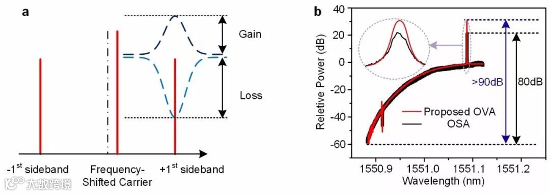 基于上述优势,基于非对称光双边带制的光矢量分析方法有望同时满足超高分辨率、超宽带和大动态范围的测量要求。作者在基于非对称光双边带调制的光矢量分析方法的基础上,选择了超高边带抑制比的移频器件,消除了残留边带,实现了动态范围的进一步提高。并采用频率稳定性好、超窄线宽的激光源,将光矢量分析的分辨率提高到接近激光器的线宽。同时,由于发射机和接收机均对光波长不敏感,结合光频梳技术、自动控制技术和多通道幅相均衡技术,可将测量范围拓展至1THz以上。