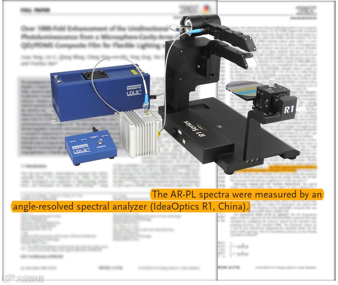 在微球腔定向天线效应提高 QD/PDMS 外量子效率的实验表征中,复享光学的 R1 角分辨光谱测量系统 是空间辐射光谱表征的有力工具:通过 空间辐射光谱 表征,证实定向天线效应可以将光致发光的角度限制在 9° 范围内,并因此提高了发光薄膜外量子效率。这为基于介电微球腔结构的光辐射调控技术的研究提供了强有力的支撑。