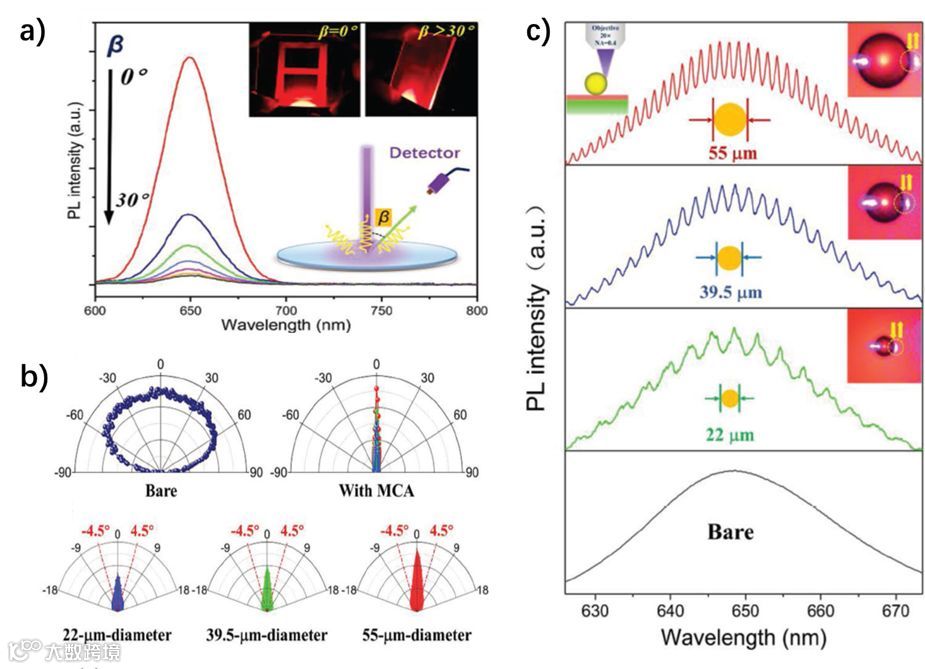 微球腔 WGM 及定向天线效应调控 QD/PDMS 量子效率的实验结果如图3所示。作者通过角分辨荧光光谱,表征样品的空间辐射特性,结果显示,样品的辐射角度被控制在垂直于样品的 ±4.5° 以内(图3b)。微球通过控制样品的定向辐射,显著提高了散射光发射的方向性,进而提高了 QD/PDMS 的外量子效率。作者再通过将激励激光聚焦到微球边缘,实现自由空间的最大耦合效率,观测到腔膜调控的微区荧光光谱(图3c)。此外,实验还证实了 QD/PDMS 的膜厚度和微球直径对量子效率的增强存在关键影响。