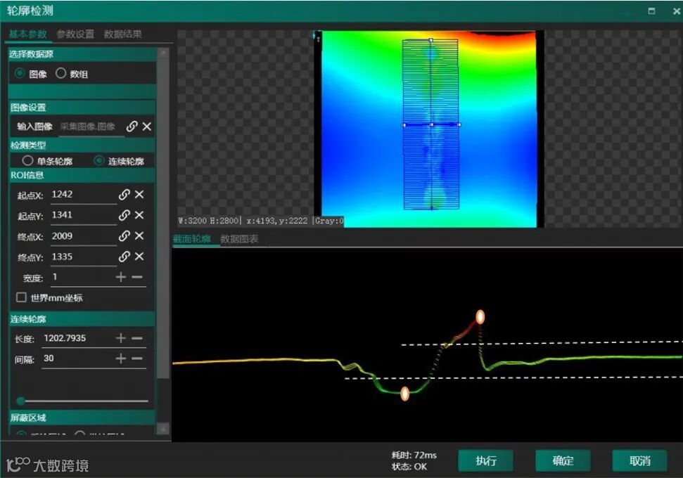 连续轮廓模式设置检测区域和轮廓间隔,检测轮廓相对于两侧基准直线的最低点