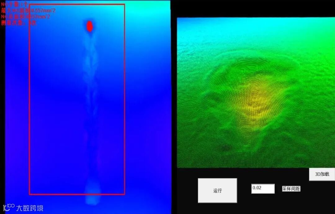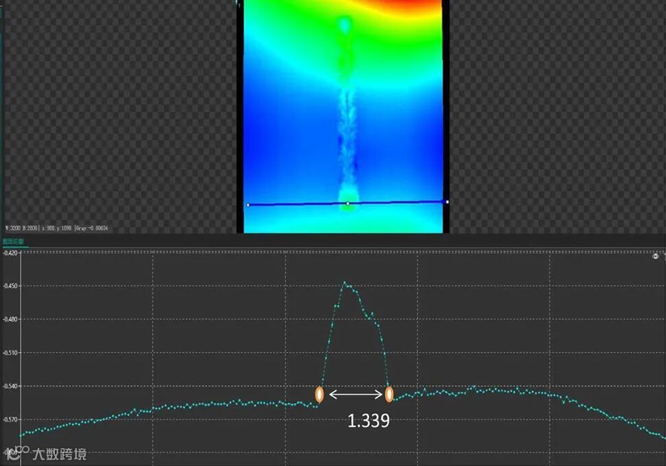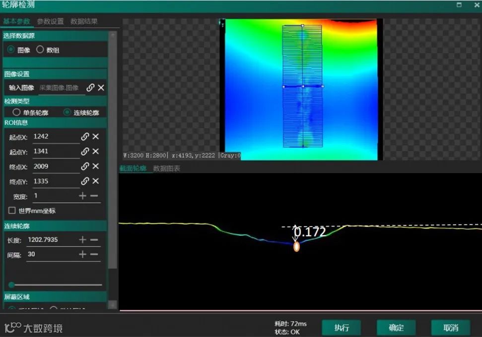 连续轮廓模式设置检测区域和轮廓间隔,通过移动基准直线截取缺陷宽度和面积