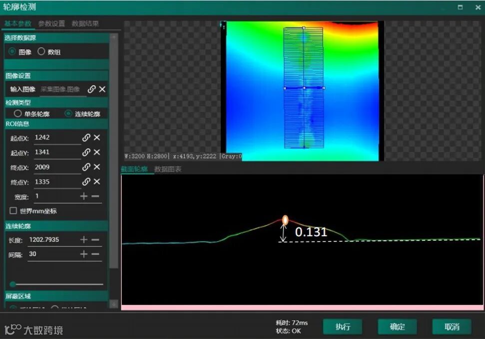 连续轮廓模式设置检测区域和轮廓间隔,检测轮廓相对于两侧基准直线的最高点