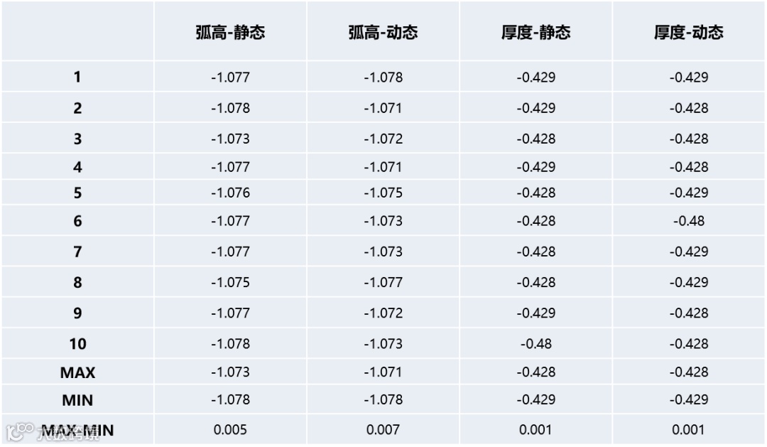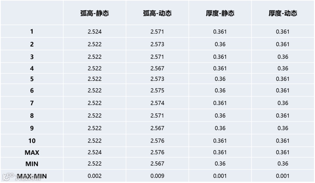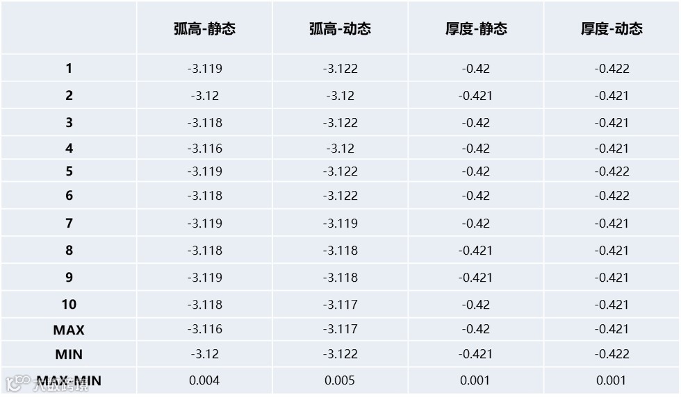 测量结果: 10次动态测量,高度重复性为0.007mm;10次静态测量,高度重复性为0.005mm;