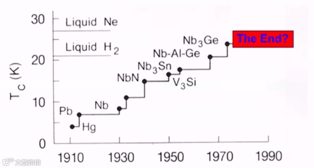 在这张图上,你可以看到该研究的发展过程,Tc是如何随着金属和时间而变化。但是到了70年代,不知为何,研究停滞不前了。大家都觉得超导性这个领域没什么很大的研究前景。
