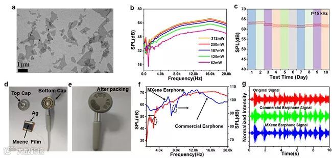 图2. MXene的表征及器件的声学测试图: a) Ti3C2纳米片的SEM图;b) AAO衬底上声谱输出图;c)稳定性测试图;d-e) 封装后的MXene耳机照片;f-g) 商用耳机与MXene耳机的声谱响应和音频信号图
