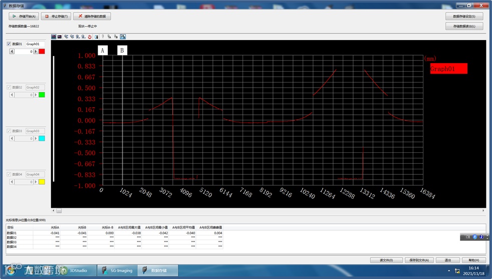 数据说明:数据结果呈现动态取点,高度差异为0.14mm,产品平面与扫描激光线存在夹角,高度值有规律增减,对数据段进行分析过滤拟合,计算平均高度差。或者针对拐点进行跟踪,关注相邻拐点高度差。