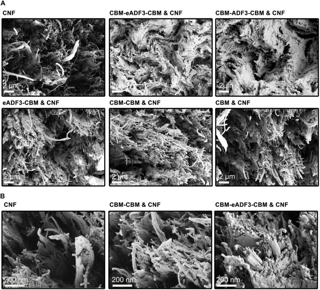 图4. 纤维的SEM断口形貌图。(A)拉伸测量试验后纤维的断裂截面。具有三嵌段蛋白CBM-eADF3-CBM的样品和CBM-ADF3-CBM显示的表面比其他样品具有更少的撕裂。(B)对比样品的断口形貌图。纯CNF,CBM-CBM&CNF以及CBM-eADF3-CBM&CNF复合纤维的断口形貌的高倍放大图像。在此放大倍数下,可以看出CBM-eADF3-CBM纤维具有明显的圆形尖端和纤维束。